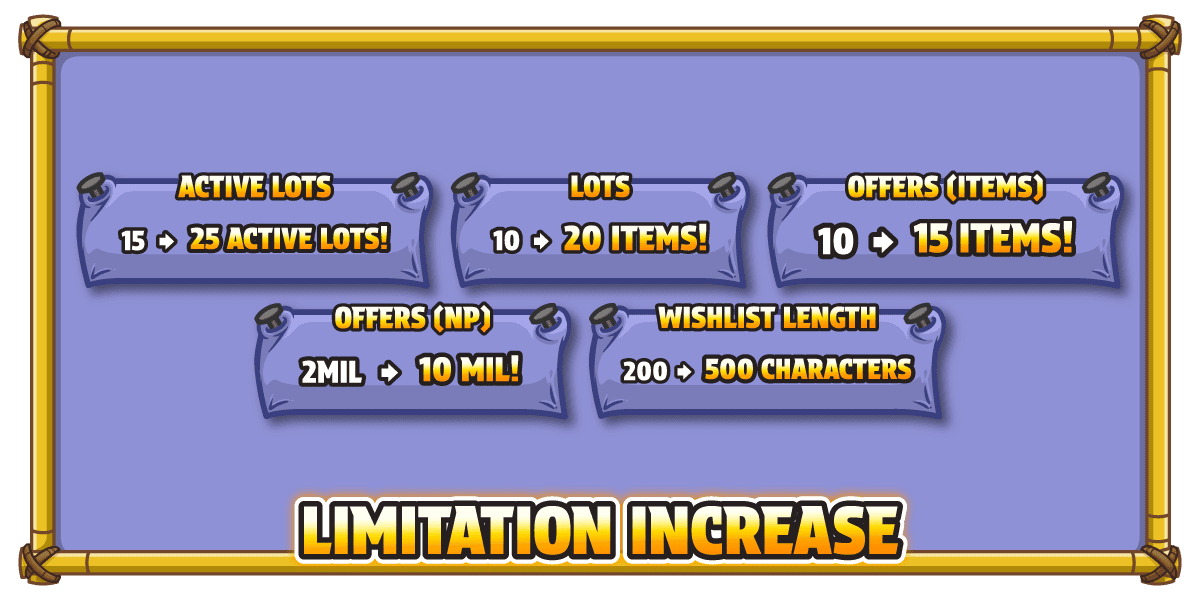 Say hello to the all-new Instant Buy option! Sellers can now enable “Instant Buy” when listing lots, letting buyers snap up your items instantly for Neopoints, no more waiting for offers or haggling. Just set your price and let the magic happen!