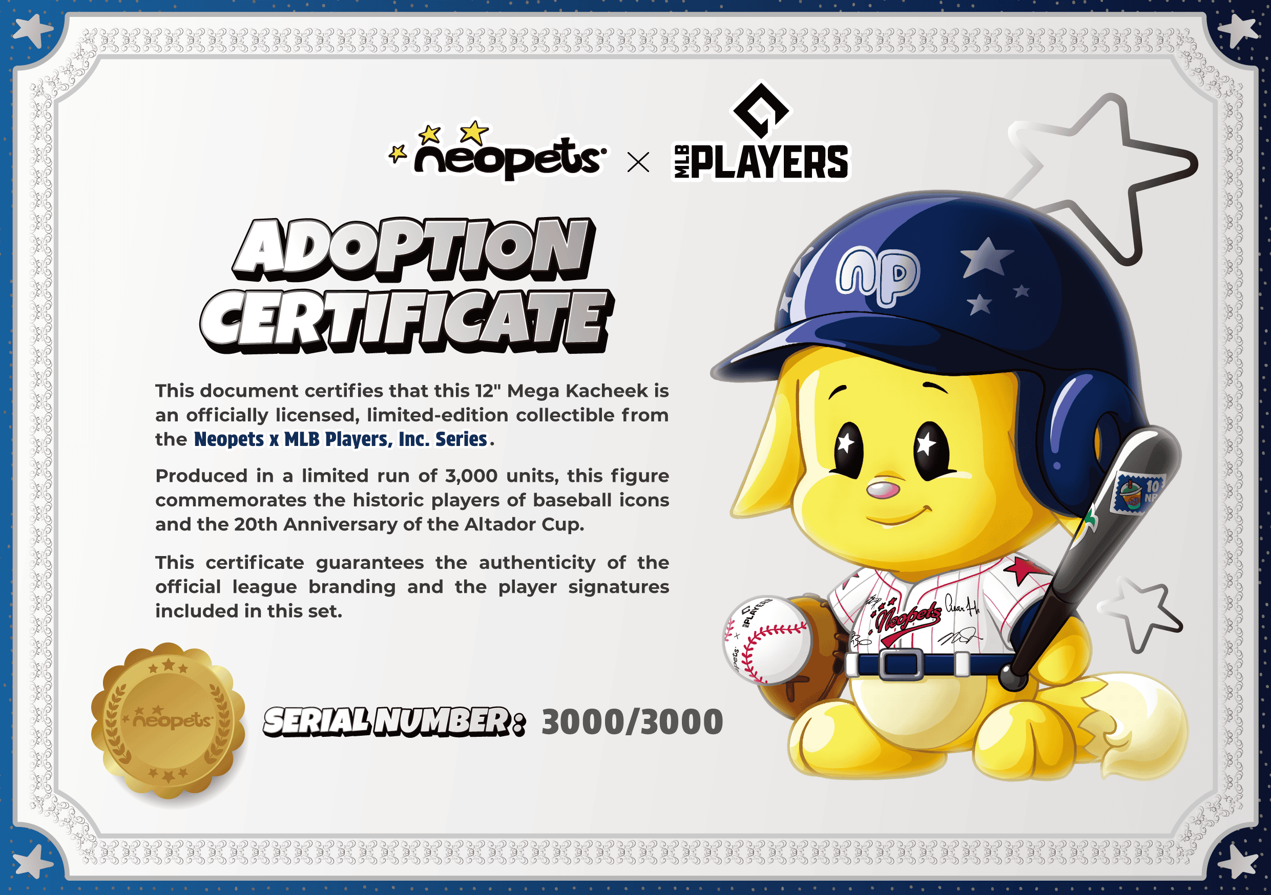 We are producing 3,000 units of this 12" Mega Kacheek. Each figure comes with its own uniquely numbered Adoption Certificate, making it a precious keepsake. Once they fly out of the stadium, they are gone for good!